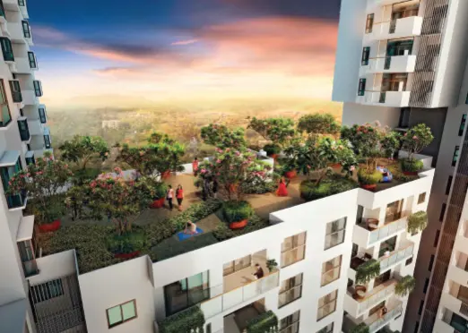 The complex includes a swimming pool, gym, clubhouse, café, yoga deck, cycling track, indoor games, co-working lounges, amphitheatre, and more, bringing resort-style living to your doorstep.